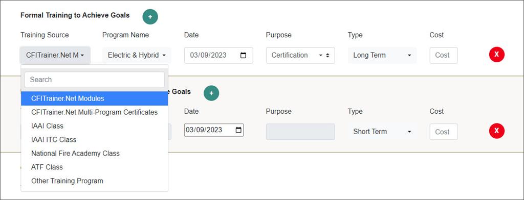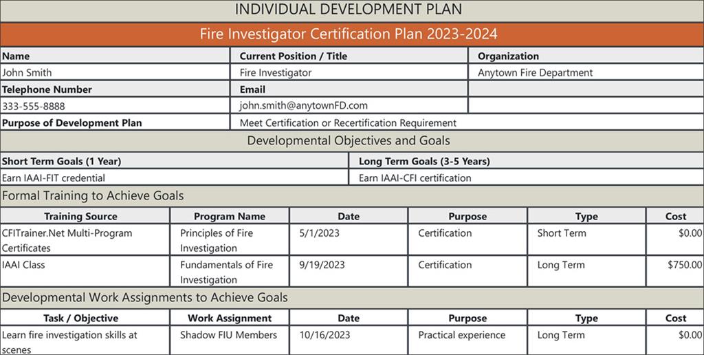 CFITrainer.Net's IDP tool is an online form that converts your responses to a downloadable PDF formatted as an individual development plan you can sign and submit to your supervisor. The IDP tool is integrated with CFITrainer.Net's modules and multi-program certificates and the IAAI's in-person classes, so you just select any relevant ones from a dropdown list. If you don't see the IAAI class you want to take in the list but it is offered on FireArson.com, you can enter its details as Other Training Program.